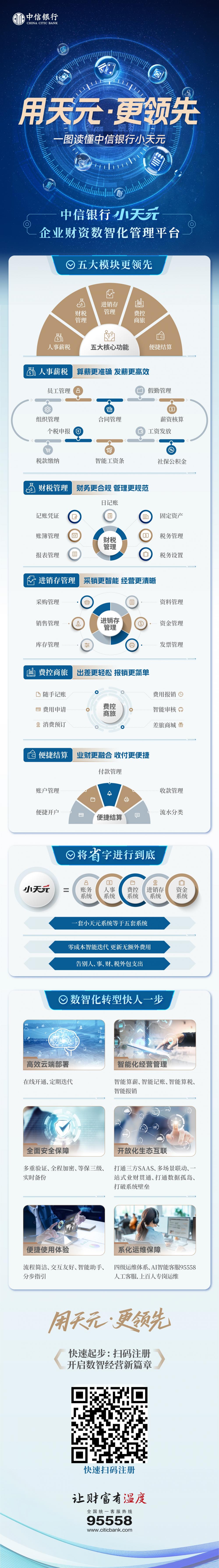中信银行“小天元”平台并吞企业平素策划痛点,将高效智能的一体化金融工作镶嵌各个门径,打造“业财资付”全链路数字化措置决议,将企业平素策划经管经由线上化、智能化、自动化,大幅普及经管质效,让企业省钱、省时、定心、省力。