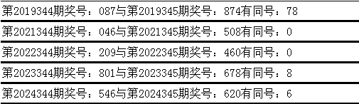 与前期历史同时奖号对比分析,在最近五年开奖中,第344期同时奖号与第345期同时奖号齐出现了疏通号码: