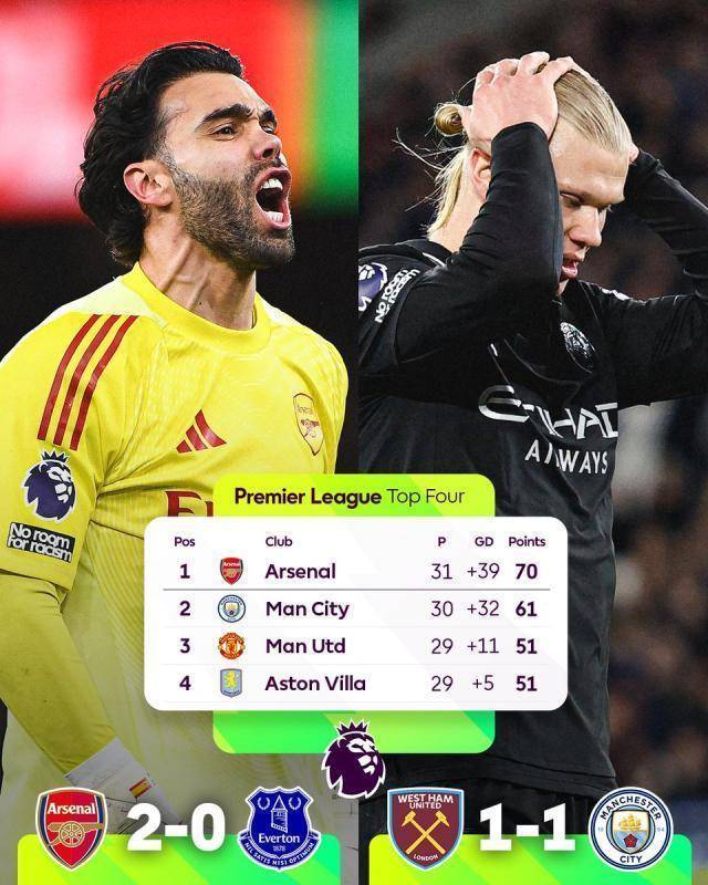 争冠的另一场短处接触发生在伦敦另一头,曼城作念客西汉姆,在先进一球、射门数据24比1碾压的情况下,被铁锤帮1比1逼平,碰到联赛2连平,同时阿森纳2连胜,这似乎阐明了枪手夺冠不仅人心归向,亦然天命所归。